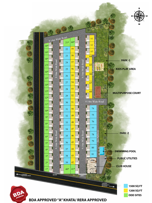 SLN Nidhi Palms is a lavish villa venture by SLN Builder on Budigere Cross, East Bangalore. The Nidhi Palms project in total Villas is 81 units and plots size Combination of 1200-1500 Sqft and SBA a combination of 2980 - 3623 sq. ft approx. Spread over a sprawling 5 acres, in close proximity to the 1 Km Away from Prestige Tranquility, is a land of diverse contours, all dressed in varied hues of green. 2 clubhouses and a host of community parks, this is not a place to build a mere home. It's a place to put down your roots for generations to come, a place to build upon your legacy, and give it a place to call home.